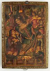 The lacquered objects, numbering more than 500, document the evolution of Islamic lacquer from the 15th to the 19th century. They show the influence of China in the early period and of Europe in the 19th century.[75] Almost every known lacquer painter in the Islamic world is represented in the collection, along with some previously unknown. The notable artists include Mohammad Zaman and Mohammad Sadiq.[75] The collection's lacquered pen box by Mo'en Mosavver is the only one he is known to have painted.[76] A 19th-century pen box, 30 centimetres (12 in) long, was commissioned by Mohammad Shah Qajar for his official Manouchehr Khan Gorji, commemorating the latter's battle against Bedouins. It depicts the battle with densely-packed scenes and describes it in Persian text.[77] An 18th-century instrument case depicts the Adoration of the Magi, and on the other side, a woman in heroic pose.[78]