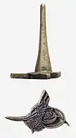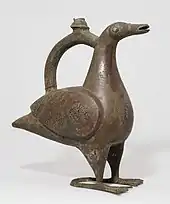 The 1,000 metalwork objects in the collection cover the period from the 6th century to the early 20th century. They come from across the Islamic world, especially Iran, the Jazira (in present-day Syria and Iraq), and 17th- and 18th-century India.[48] The objects include bowls, incense burners, and ewers.[49] Brass and bronze are common materials.[50] Metalworkers in 12th- and 13th-century Iran made vessels and incense burners in the shape of birds and animals, and the collection includes several examples.[51] The objects' decorations range from arabesque patterns to inscriptions and to figurative art.[50]