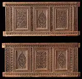 Although it is rare in Islamic metalwork for artists to sign or date their pieces, several objects in the collection have signed names or dates.[48] Some bear the names of patrons;[48] for example, a 14th-century silver-inlaid brass bowl bears the name of Al-Nasir Muhammad, a 13th-century Mamluk Sultan.[52] A brass casket from early 13th-century Jazira, lavishly inlaid with silver, has four numeric dials; these formed part of a combination lock whose mechanism is now missing.[53]