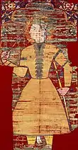 The more than 250 textiles include embroideries, carpets, and costumes from the 6th to the 19th centuries.[71] The carpets come from royal workshops across the Islamic world.[71] Other textiles include Ottoman and Safavid gold brocades and woven silks from Mughal-era and Sultanate India. The costumes include shawls from Kashmir, talismanic shirts, and ikat coats.[71] The 16th-century Ottoman court used European textiles as robes of honour, later creating its own looms to control production.[72] Some of the collection's textiles have explicitly religious purposes: a North African silk panel repeats the name of Allah hundreds of times and a carpet was used as a mihrab (prayer niche).[73] The Dhulfaqar, a double-bladed sword said to have been taken in the battle of Badr, is a motif appearing on two Ottoman banners.[74]