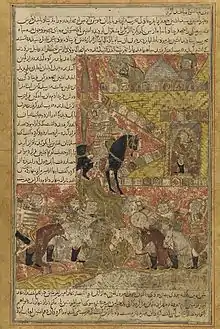 Afshin, upon the camel, parades Babak, upon the elephant, into Samarra. Persian miniature created in 16th-century Safavid Iran, from a copy of Abu Ali Bal'ami's 10th-century Tarikhnama