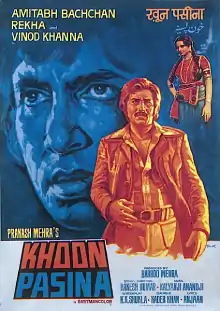 Khoon Pasina (Hindi: खून पसीना, Blood and Sweat) is a 1977 Hindi action crime film. The movie is produced by Baboo Mehra and directed by Rakesh Kumar. The movie stars Amitabh Bachchan, Vinod Khanna, Rekha, Nirupa Roy, Asrani, Aruna Irani, Bharat Bhushan and Kader Khan. The music is by Kalyanji Anandji. This was another "super hit" movie of Amitabh Bachchan. A comedic action scene featuring Bachchan fighting a tiger as well as a taciturn Vinod Khanna are the highlights of the movie.