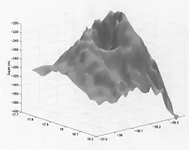 A submersible survey in 2003 detected a crater with active fumaroles releasing cold and hot gas bubbles. Samples of fresh olivine basalt were collected. An arc-shaped collapse structure appears on the west flank and was the apparent source of a submarine debris avalanche extending 15 km (49,000 ft) down the ridge slope to the west toward the Grenada Basin.[7] The Global Volcanism Program reports the summit to be 185 m (607 ft) below the sea surface.