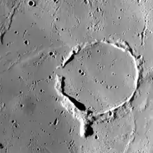 Kies is the remnant of a lunar impact crater that has been flooded by basaltic lava, leaving only a remnant of the outer rim. It was named after German mathematician and astronomer Johann Kies.[1] It is located in the Mare Nubium almost due south of the crater Bullialdus. Northwest of Kies is König. To the south-southwest lies a lunar dome structure designated Kies Pi (π). It has a small crater at the top and is most likely volcanic in origin.