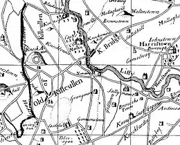 The new town officially known and mapped as Kilcullen Bridge began to develop after 1319 when a bridge across the River Liffey was constructed at that place by a canon, Maurice Jakis (or Jacquis or Jakes), of Kildare Cathedral. It took over, over succeeding centuries, from the old centre, though until the late 19th century, Old Kilcullen townland had a greater population than Kilcullen Bridge. Originally, as shown on maps even as recently as the late 18th century, the new settlement was wholly on the eastern bank of the River Liffey.