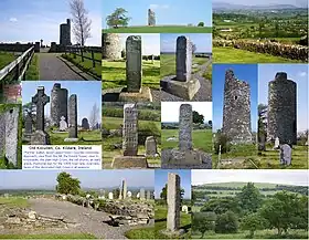Old Kilcullen, formerly Kilcullen (Cill Chuilinn, "the Church of the Holly" in Irish), is a townland in County Kildare, Ireland, which includes a noted religious archaeological site within its boundary. As a townland it is relatively large (792 acres) but lightly populated (79 premises). The location of the townland is roughly contained within the R418 and R448 routes starting at its most northerly point, a crossroads known locally as Thompson's Cross. The townland continues south from this point as far as Harklow and is intersected in its north east corner by the M9 motorway at Abbeyaun. Old Kilcullen was formerly the site of a walled town, and before that of an ecclesiastical settlement dating from the 5th century. The original settlement gave its name to the substantial surrounding civil parish and barony.