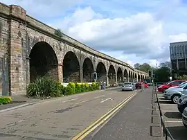 Kilmarnock railway viaduct, known locally as The Viaduct, is a railway viaduct crossing the town centre of Kilmarnock, and was constructed between 1843 and 1850. The bridge begins at Kilmarnock railway station and leads to destinations in England. It is a most distinctive feature of the town centre with 23 masonry arches and defines the northern boundary of the town centre. It was built in the 1840s to enable the GlasgowKilmarnock line to continue to Carlisle.[1]