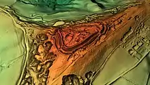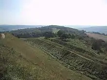 The hill fort has been dated to the first century BCE[6] and is a scheduled monument.[7] Pottery, coins and other archaeological finds have been found dating from the Iron Age through to the 3rd century CE in the Roman era.[6]