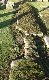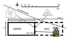 The remains of the former parish church dedicated to St Erchard and the Virgin Mary, which appears from documentary evidence to have been a minster in origin.[20] St Erchard is said to have been a local disciple of St Ternan [21] and to be buried in the church. The ruin, of small stones and run lime was repaired and stripped of ivy etc in 1931 to reveal possible 14th century detail including a fine walled-up north door and lancet windows. The granite belfry probably dates from about 1640. The date of foundation of the church is not known but it passed into the possession of the hospital in its foundation before 1231. Foundations which extend 22 meters east of the east gable and architectural peculiarities of the gable itself suggest that the hospital may have adjoined the church on the east. Two windows in the upper part of the gable look into the church as if from an upper floor of the adjoining building as occurred in some monastic buildings in order that sick persons might hear the service. In this case the lancet windows in the east gable would be later insertions, probably dating from the period when the adjoining building was removed. They may in fact have belonged to that building. The church was in use until 1861 when a new church was built. The roof was removed in 1862 and in 1869 the interior was divided into private burial grounds for the ministers and certain of the heritors. Granted with all its pertinents to the hospital of Kincardine O'Neil by its founder, Alan Durward, before 1231, this grant was confirmed in 1250. Along with this church apparently passed its four pendicles of Glentanar, Lumphanan, Cluny and Midmar. The last two of these may, however, have been granted to the hospital independently and were served by vicars in 1274, the hospital master then being taxed 'pro omnibus eclesiis'. In 1330 the hospital with its annexed chapels was erected with the consent of Duncan, earl of Fife, into a prebend of Aberdeen cathedral by Bishop Alexander de Kyninmund. The residual fruits of this prebend with its four annexed chapels were appropriated in 1501 to the Chapel Royal at Stirling, provision being made for vicar pensioners, but it is doubtful whether this was effective. The prebend itself remained with a canon of Aberdeen cathedral, who possessed the parsonage and vicarage teinds of all four pendicles, but only the parsonage teinds of the mother church, the cure being served by a perpetual vicar. The church measures 20.6m by 8.3m with walls 1.0m to 1.3m thick. The foundations on the east side are clearly visible, just protruding through the turf and denote a building of similar dimensions to the church. The North-East corner of the foundations are destroyed.