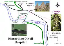 Kincardine O'Neil Hospital was founded in the 13th century in the village of Kincardine O'Neil in Scotland.[1][2] Almost certainly it served as a traveler's inn and as a hospice for elderly and "poor" men. The hospital was situated adjacent to a bridge over the River Dee and may have been a chantry[Note 1] for the early Bishops of Mortlach (See Bishop of Aberdeen).[3] Remains of a building can be seen abutted to the Auld Parish Church in Kincardine O'Neil.[4][5][6][Note 2] This building may have been a later or second hospital. It is also possible that these ruins may have been part of St Erchard's Church - a.k.a. St Marys' or the Auld Kirk.