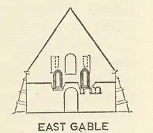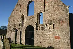 The most comprehensive archaeological survey of the Church and the remains of the hospital are found in Douglas Simpson's book.[10] In this he identifies the lancet windows in the east gable as strong evidence for the existence of the abutted building - the hospital. His argument is that the residents of the hospital - both travellers and the sick or needy would be able to hear Mass from the Church through the windows. The windows, when viewed from the outside of the church ruins (the east end) are clearly internal windows. See the photograph alongside. Douglas Simpson writes as follows:[10]