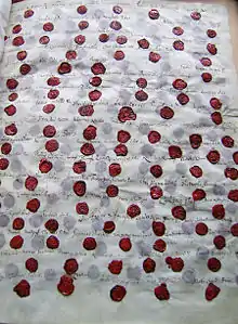 The King's Law was read aloud during the king's coronation and anointing, but not published until 1709. Two original copies are currently accessible to the public, one at the Danish National Archives, and one at Rosenborg Castle (both in Copenhagen).[18] The copy at Rosenborg is Queen Margrethe II's private property and is stored in the treasury vault along with the Danish Crown Regalia.[18]