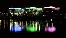 New facilities were procured under a Private Finance Initiative contract in 2005. The works were carried out by Skanska at a cost of £300 million and opened in 2011.[5] The design incorporated surface-solar energy heat recovery from an adjacent reservoir, which provides one-third of the heating and all of the cooling requirements for the complex. This involved submerging a grid of 140 stainless steel plates into the water at the deepest point, connected to the hospital via twin 350-millimetre (14 in) pipes laid under the A38 dual carriageway road.[6]