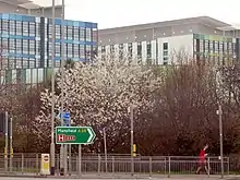 The hospital in 2013 showing Main Entrance beyond the paving, Outpatient Clinics to the left, Women and Children's Centre to the right and Wards in the Towers behind