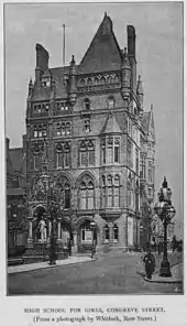 KEHS was founded in 1883 with Edith Creak as the founding head. She had already broken glass ceilings at Cambridge and London University.[1] The school occupied part of the 1838 New Street boys' school (Charles Barry, architect). In 1887, when the adjacent Hen & Chickens Hotel was known to be closing the governors considered acquiring it. In 1888, KEHS moved to the recently vacated, and almost brand new (1885), Liberal Club in Congreve Street (a site now covered by the lending section of the Birmingham Central Library) under a short lease. Meanwhile, plans for a new school on the Hen and Chickens site were being drawn up by the foundation's architect,J. A. Chatwin. In 1892, land behind the hotel was bought with the intention of building the girls' school off the main road. The New Street school opened in 1896. It moved, along with the boys' school, to its present location opposite the University in 1940 to new buildings designed by Holland W. Hobbiss. At this time a new, green uniform was introduced. The New Street site was bought by the Prudential Assurance Company and leased for the Odeon cinema.