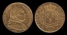 The Great Powers occupying Paris demanded that Louis XVIII implement a constitution.[89] Louis responded with the Charter of 1814, which included many progressive provisions: freedom of religion, a legislature composed of a lower house styled the Chamber of Deputies[lower-alpha 2] and an upper house, styled the Chamber of Peers. The press would enjoy a degree of freedom, and there would be a provision that the former owners of the Biens nationaux, confiscated during the Revolution, would be compensated.[90] The constitution had 76 articles. Taxation was to be voted on by the chambers. Catholicism was to be the official religion of France. To be eligible for membership in the Chamber of Deputies, one had to pay over 1,000 francs per year in tax, and be over the age of forty. The King would appoint peers to the Chamber of Peers on a hereditary basis, or for life at his discretion. Deputies would be elected every five years, with one fifth of them up for election each year.[91] There were 90,000 citizens eligible to vote.[92]