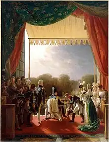 The Count of Artois ruled as Lieutenant-General of the Kingdom until his brother's arrival in Paris on 3 May. Upon his return, the King displayed himself to his subjects by staging a procession through the city.[85] He took up residence in the Tuileries Palace the same day. His niece, the Duchess of Angoulême, fainted at the sight of the Tuileries, where she had been imprisoned during the time of the French Revolution.[86]