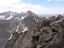 There are several prominent subranges of the Sierra within and around the park. The Palisades, along the park's eastern boundary, have four peaks over 14,000 feet (4,300 m) including the highest point in the park, 14,248 feet (4,343 m) NAVD 88 at the summit of North Palisade.[10] The Great Western Divide extends through the south-central part of the park and also has many peaks over 13,000 feet (4,000 m), including Mount Brewer.[11] The Monarch Divide, stretching between the lower Middle and South Forks of the Kings, has some of the most inaccessible terrain in the entire park. In the northwest section of the park are other very steep and rugged ranges such as the Goddard Divide, LeConte Divide and Black Divide, all of which are dotted with high mountain lakes and separated by deep chasms.