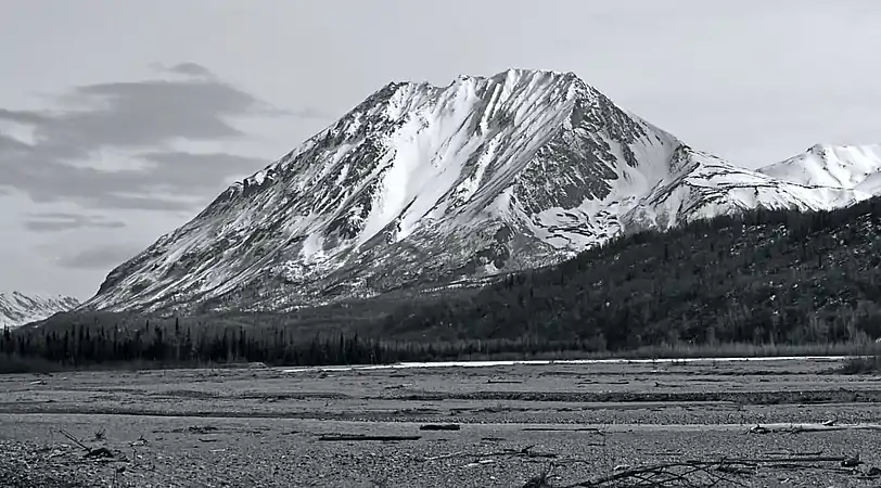 Kings Mountain, also commonly called King Mountain, is a prominent 5,809-foot (1,771 m) elevation mountain summit located 22 mi (35 km) northeast of Palmer, in the northwestern Chugach Mountains of the U.S. state of Alaska.[2] This landmark of the Matanuska Valley is set between Anchorage and Glennallen, at mile 75 of the Glenn Highway. It is situated 18 mi (29 km) west of Amulet Peak, and 12 mi (19 km) east-southeast of Granite Peak. The mountain was named after Al King, a prospector who had a cabin nearby at the confluence of Kings River and Matanuska River.[3] The name was used by prospectors, reported about 1905 by the U.S. Geological Survey, and officially adopted in 1906 by the U.S. Board on Geographic Names.[2][4] This peak is known as Bashtl'ech' in the Denaʼina language, and Bes Tl'ets' in the Ahtna language, meaning "black stone".[5]