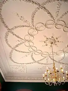 Visitors to the house as it stood after the completion of Vanbrugh's design would have first encountered a huge entrance saloon, two stories high.[22] Beyond this was a stair hall of three storeys in height, with arched openings to the entrance saloon at first-floor height, so that the upper part of the entrance saloon could be seen from within it.[22] These arches were filled in as part of Mylne's remodelling, which though it increased the comfort and charm, reduced the spatial drama.[22] The additional wall space in the entrance saloon was designed to display Southwell's recently inherited collection of ancestral portraits, and Thomas Stocking was employed to execute a scheme of plaster framing for these to Mylne's design.[23] A black and white chequered marble floor and a chimneypiece by John Devall were also added to the entrance saloon at this time.[23]