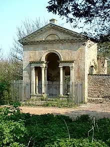 The entrance front, on the southwest, has a centre containing six Corinthian pilasters, with those at each side paired to produce three bays, each of which contains a round arched window. The pediment has a central lunette, and each side consists of two bays in which the windows have wide flat surrounds.[18] There are four parapet vases.[18] The steps originally had low flank walls perpendicular to the facade, which were removed in the later remodelling.[19]