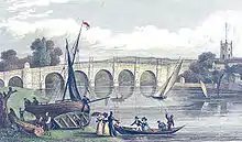 Leland refers to a contemporary bridge and to an older wooden bridge that had existed at Kingston since the 13th century. This was about 100 feet downstream of the present bridge: Old Bridge Street at Hampton Wick used to be matched by an Old Bridge Street on the Kingston side.[5] In 1318 the bridge was described as being in a dangerous condition.[6] The successive bridges contributed greatly to Kingston's success as a medieval market town.