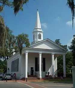 Kingston Presbyterian Church is a historic Presbyterian church located at Conway in Horry County, South Carolina.[3][4] The sanctuary was built in 1858 and is an outstanding example of antebellum Greek Revival ecclesiastical design. The three-bay façade features a portico set on square columns with recessed panels and square pilasters. It was originally sheathed with weatherboard, but was covered in stucco in 1930 when a stuccoed brick addition was added to the rear. Also on the property is a Colonial Revival style brick educational building built in 1956. It is co-located with the Kingston Presbyterian Church Cemetery, listed on the National Register of Historic Places in 1986.[4]