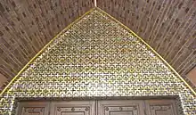 The painter and art professor Hermann Sandkuhl (in German) created decorative sgraffiti displaying various figures, situated in the intermediate recessed spaces between the brick pilasters on the building's exterior. All were destroyed in the fire in 1943.[8] The tympanon decoration by Erich Waske (in German) adorning the final, somewhat smaller, girder above the oriented quire, depicting the Sermon on the Mount and showing Jesus of Nazareth with a corona of light, was also lost in 1943.[8] The prayer hall is illuminated by three long windows in the quire. The original windows were completely shattered during the bombing of the city. In 1962, Sigmund Hahn designed a new central quire window and during the course of the renovation of 1990/1991 Achim Freyer (in German) added colorful new windows to the left and right of the quire.[9] Höger's original Baptismal font of clinker brick, adorned with gold paintings, survived the war intact. Regina Roskoden's abstract basalt sculpture of an angel, graphics by Max Pechstein and a painting of the crucifixion by Hermann Krauth are displayed in a by-room. Considerable offertories from parishioners enabled the purchase of a new organ of 60 registers, built by E. Kemper & Sohn and installed after 1965, which required the removal of the second western loft gallery of seats.[8]