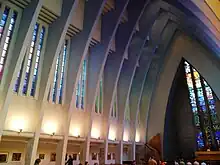 Inside, the actual main floor consisting of nave, aisles, choir and altar is elevated, above the ground-level floor housing a fellowship hall. The entrance at the building's western end is flanked on both sides by the cladding of two round staircases. The semicircular flights of stairs lead to the ogival main inner portal, which announces the dominant forms of the interior. The church's west-facing elevation, as a whole, provides an eye-catching flank to the eastern edge of Hohenzollernplatz.[1]