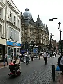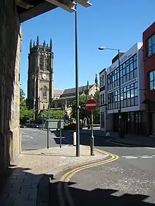 The city's first hospital was established in a house on the street in 1767. In 1790, the Ancient Order of Foresters was founded at the Crown Inn on the street, although the building was demolished in 1935.[5] In the 19th century, the Kirkgate Market was constructed at the city centre end of the street, while a railway line was built, spanning the middle of the street.[2] In 1984, a police officer, John Speed, was shot and killed on the street, and there is a memorial in his memory.[6]