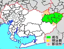 On April 1, 1955, the town of Hongō merged with the neighboring villages of Midono, Shimokawa and Sono to form the town of Tōei. The village of Miwa joined the new town the following year, on July 1, 1956. An administrative reorganization later that year left the district with three towns and three villages.