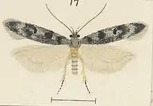 The wingspan is 15โ16 mm. The forewings are dark slaty fuscous, irregularly sprinkled or mixed with whitish grey. The markings are cloudy, formed by absence of pale mixture. Spots represent the stigmata, with the plical rather obliquely before the first discal, a thick oblique bar from the costa terminating in these two and with an additional spot midway between the plical and the base. There is an angulated more or less distinct grey-whitish transverse shade at three-fourths. The hindwings are light grey.[2]