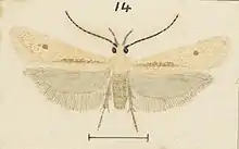 The wingspan is 10โ13 mm. The forewings are ochreous-whitish with a ferruginous suffusion along the fold, sometimes extended to before the apex, sometimes absent. The area beneath the fold is usually clearer white. The hindwings are pale fuscous-grey.[2]