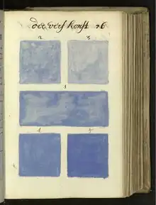 The Klaer Lightende Spiegel der Verfkonst (literally: "clearly lighting mirror of the painting art") is a manuscript with over 700 pages[1] of color swatches, produced in 1692[2] by a Dutch author from Delft known only as A. Boogert.[3] The book is arranged according to the Aristotelian system rather than the spectrum, which had recently been described by Newton.[1] Only one copy of the manual is known, and it is completely handwritten and hand-painted.[4] It is kept in the Bibliothèque Méjanes in Aix-en-Provence.[5]