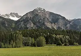 Klapperhorn Mountain, elevation 2,301-meters (7,549-feet), is located in Mount Robson Provincial Park, just south and within view of the park's visitor centre. It is the northernmost peak of the Selwyn Range,[1] which is a subrange of the Canadian Rockies. Precipitation runoff from the peak drains north into the Fraser River. Topographic relief is significant as the summit rises 1,400 meters (4,600 ft) above the Robson Valley in 2 km (1.2 mi). The Yellowhead Highway (Highway 16) and Canadian National Railway traverse the northern base of the mountain. The nearest neighbor is line parent Overlander Mountain, 2.0 km (1.2 mi) to the southeast.