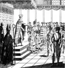 In the beginning, it was not stated in advance who will be knighted during the coronation. In 1563, at the coronation of king Maximilian I some nobles were knighted who fought successfully in Turkish wars, like György Thury, Antal Székely, László Gyulaffy and Miklós Hennyey.[36] However, there also appeared a lot of people who were unworthy of honoring this title, but simply jostled themselves forward during the coronation, so the knighting ceremony had to be abandoned. For this reason, in later times the palatine (the military leader of the country) was entitled to choose the candidates for knighting.[37] In 1598, Archduke Matthias made knights of golden spur Ferenc Nádasdy and Miklós Pálffy in Győr, newly recaptured from the Turks. New knights were made in 1608, during the coronation of Matthias II.[38]
