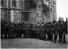 Persons to be knighted were proposed by the palatine, and later on, from the end of the 19th century by the Prime Minister. The number of the knights was different on each coronation. Albert I knighted 84 persons,[48] Charles III 6, Maria Theresa 44 (25 nobles and 19 citizens), Leopold II 33, Francis II 48, Ferdinand I 27, Franz Joseph I 28, Charles IV. 47. In the latter coronation, all the knights came from the battlefield soldiers. Half of them originated from old noble families, and there were also soldiers from various military corps. The soldiers were allowed to left the front or the hospital facilities to participate the coronation. Originally, 51 persons received invitations, but only 47 of them arrived to the coronation in time. The intention was to raise those soldiers for knights of golden spur who already were given war medals for their valiant conduct against the enemy.[49] They got their imaginary honors to their battlefield-gray uniforms.