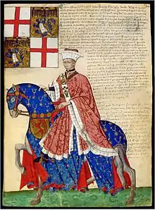 The sources mention the first Hungarian knights of golden spur during the coronation of Hungarian Angevin rulers, but they also indicated that this was part of the ceremony already at the time of the Arpadian kings. In 1790, the Hungarian jurist Adalbert Barics believed that they were perhaps servants of king St. Stephen, and were obliged to fight with him in the battles; or the first knights might be ordered by king St. Ladislaus to assist at the reburial of St. Stephen in 1083. According to Barics, the knights were entitled to wear golden spurs, and perhaps golden armour. They also were the only persons to enter the royal court with golden horse trappings, and for some patriotic services they had to be rewarded with two times of the value of nobles' reward. If the nobles, for example, received a gold chain worth of two hundred florins, the knights of golden spur had to be donated with a gold chain worth of four hundred florins.[21] (It is possible that the privileges of Charles I of Hungary from 1327 to magister Doncs also belong to the tradition of the Knights of the Golden Spur. He was entitled to change the Argent parts of his coat of arms, crest and banner to Or, but only in case, if he takes part in the war by the King's side. When Charles I of Hungary died (16 July 1342), three mounted knights were set guard in front of the gates of the Buda church, to personalize the king. According to the Chronicon Pictum of Márk Kálti: "One of the gallants was adorned with a tournament dress suitable for the royal dignity, the next with a dress suitable for the spear-struggle, and the third wore the royal majesty's battle-armory... The gallants ... wore golden helmets and their crest was an ostrich [head with horseshoe in the beak]: as like as the gallant king used to wear and use them in his life. ...all these were the king's belongings during his life."[22] According to the description, the king had a special armory for the "tornamentum"s and the "hastiludium"s, suitable for two different types of tournaments.)
