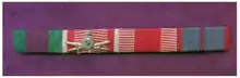 The medal from the front side shows a white enameled double cross, with the letter K (Károly) in the middle. Above the cross was placed the Holy Crown of Hungary, and the cross is surrounded by a green enameled dragon, symbolizing the Order of the Dragon. The dragon and the cross are by three quarters surrounded by an ornate golden spur. The height of the memorial sign is 67 mm, the width is 44 mm. It was worn on the red ribbon (wide 40–50 mm or more), lined by green (the ribbon of Order of Saint Stephen of Hungary). On the back side of the medal, only the dragon was worked up in detail.[5] At that time, gold and silver honors began to be replaced by bronze and zinc, and only the highest orders were made from precious metals.