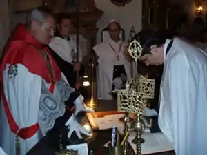 Among the Order's objectives are to encourage, advocate and spread any kind of activity (artistic, economic, cultural or architectonic) which could contribute to the conservation and improvement of the grave of Saint John of God, whose defense is sworn by the Knights. The Superior General of the Hospitaller Brothers serves as the Grand Master, currently Brother Juan Jose Hernandez Torres, O.H.[1] The Knights' motto is Deus charitas est (God is love).