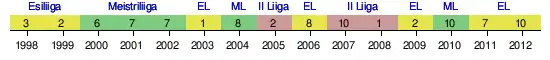 | 2006 | Esiliiga | 8 | 36 | 10 | 3 | 23 | 46 | 99 | -53 | 33 | Anton Semjonov (12) |