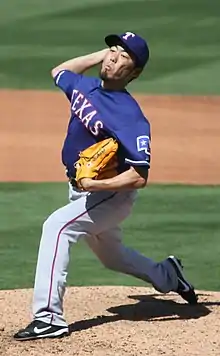On July 30, 2011, Uehara was traded to the Texas Rangers for Chris Davis and Tommy Hunter. The move reunited him with his old high school teammate Yoshinori Tateyama.[4] After starting the season with superb numbers for the Orioles, his second half, with the Rangers, would prove to be a rough one. He was 1–2 with a 4.00 ERA after the trade. Matters would get worse in the postseason when he gave up three home runs in 1+13 innings to compile a 33.75 ERA before being left off the roster for the World Series due to his ineffectiveness. He would finish 2011 with a 2–3 record, 2.35 ERA, and 85 strikeouts in 65 innings after pitching for the two different teams.[5]