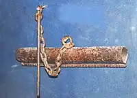 The upper half of the instrument is shaped like the comb on a cock's head, hence the name. The instrument consists of a hollow iron tube with teeth and an iron rod connected to the body by a chain.[2]