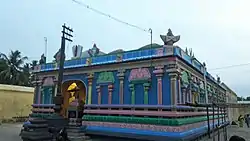 Kola Valvill Ramar Temple is located in Tiruvelliyangudi, a village located 19 km (12 mi) away from the Kumbakonam on the Kumbakonam - Chennai highway. The temple has a three-tiered rajagopuram (gateway tower) and is enclosed within brick walls. Leaving the central shrine of the presiding deity, which is built with granite, all the other shrines are built with brick.[6] There are separate shrines for the consort of Kolavalli Ramar, Maragathavalli.[7] The presiding deity, Kola Valvill Ramar, is sported in Bhujanga sayan (reclined) posture. The vimana (roof over the sanctum) has Varthaga vimana pattern. There are four water bodies namely, Sukra, Brahma, Indra and Parasara that are associated with the temple.[8]