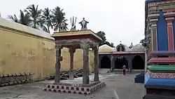 The temple is counted as Vaishnava Sukra Kshetra as Vishnu appeared as a beautiful deity to please his devotee Shukra (Venus).[9] The place derived its name Thiruvelliyangudi hence and the presiding deity is also referred to as Velliyan. It is believed that Vishnu appeared in Kalyana Kolam (marriage posture) to Parasarar, Markendeyar, Mayan, Brahma, Sukran and Bhudevi. To de-stress or relieve Vishnu, his mount or vahana, the eagle Garuda, holds the conch and the Sudarshana Chakram or disck-like wheel of Vishnu which is unique in nature, making this the only temple where Garuda is depicted in such a posture. Sage Parasarar is believed to have done penance in this temple and hence there is a temple tank called Parasara Theertham. A banana plant is seen growing from a granite base and it is believed to be historical.[6] The temple is revered in Nalayira Divya Prabandham, the 7th–9th century Vaishnava canon, by Thirumangai Alvar in one hymn. The temple is classified as a Divya Desam, one of the 108 Vishnu temples that are mentioned in the book.[7]
