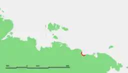 The gulf is more than 300 km wide. Its limits are the NE projection of the Kolyma Lowlands close to the Medvyezhi Islands in the west and the Nutel'gyrgym Peninsula and Ayon Island in the east.[1]