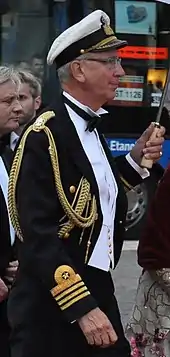 A senior captain wears a large aiguillette (stor ägiljett m/1816) to mess dress, service dress uniform in connection with representation (equivalent), and to full dress uniforms. For uniform parts without a shoulder strap (axelklaff), a shoulder girdle is used in the navy (if applicable with a royal name cipher) to attach a large aiguillette to the shoulder next to the shoulder seam. For the inner jacket (innerkavaj m/48) and the mess jacket, the aiguillette is attached to two small buttons under the coat.[14]