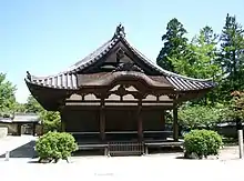 The temple's main hall (3) is the 7×7 ken Kon-dō, with a one ken step canopy and an irimoya-style[ex 1] roof of the hongawara type.[ex 2] Built in 1320 it houses the temple's main object of worship: Dainichi Nyorai flanked by Fudō Myōō and Trailokyavijaya. The group of three sculptures has been designated as National Treasure.[10][11]