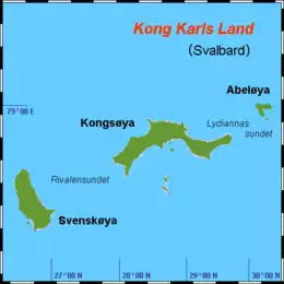 Kong Karls Land or King Charles Land is an island group in the Svalbard archipelago, in the Arctic Ocean. The island group covers an area of 342 km2 (132 sq mi) and is made up of the islands of Kongsøya, Svenskøya, Abel Island, Helgoland Island, and Tirpitzøya.
