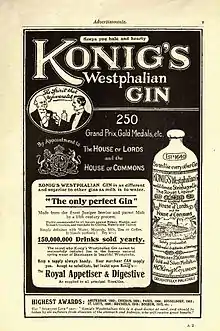 Konig's Westphalian Gin was a Steinhäger gin produced up to the early part of the twentieth century from mineral water at H. C. König's "model distillery" in Steinhagen, Westphalia, Germany, said at the time to be the largest and the oldest gin distillery in the world. The gin was first produced in 1640.[1]